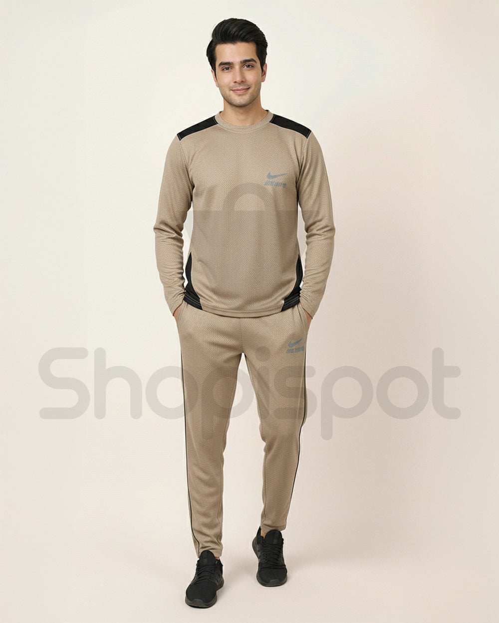 Elevate your athletic wardrobe with this sophisticated tracksuit, expertly designed for both performance and style. The neutral beige base provides versatility, while strategic black accents create sharp visual contrast and definition. Crafted from premium materials, this two-piece set delivers comfort during workouts and casual wear alike. The tailored fit ensures a flattering silhouette, while quality construction guarantees durability through repeated wear. Perfect for gym sessions, outdoor activities, or relaxed everyday styling, this tracksuit combines functionality with contemporary aesthetics.